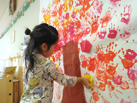お部屋にりんごの木をつくることにしました🍎葉っぱは手形で、りんごやどんぐりは折り紙でつくりましたよ!