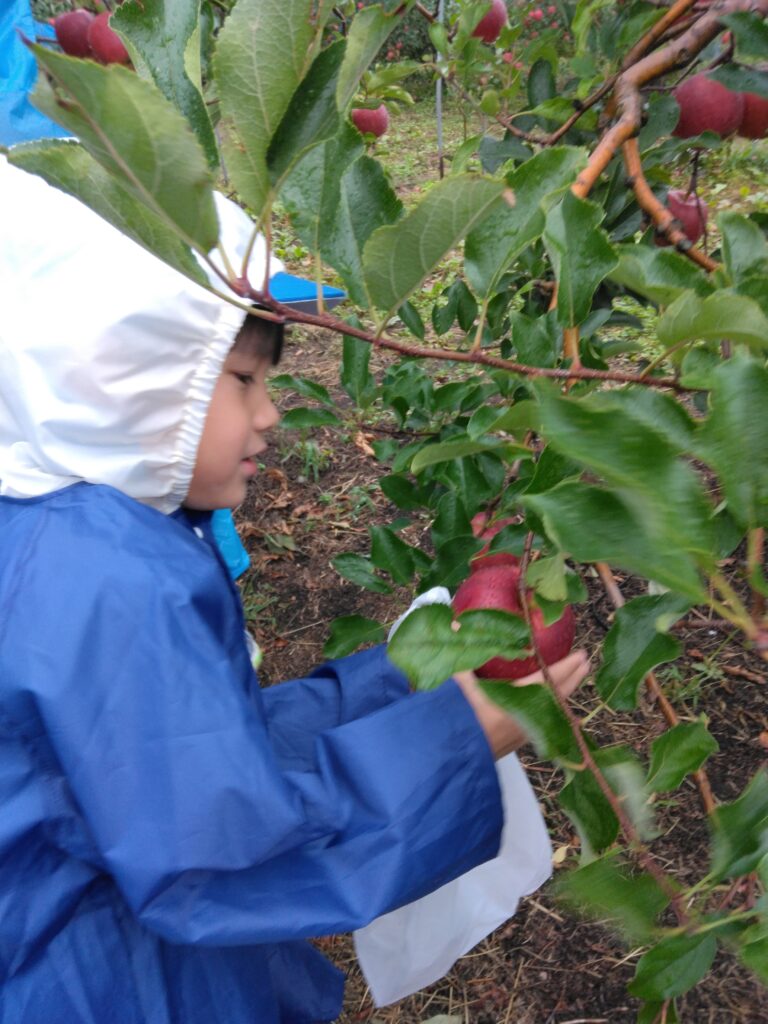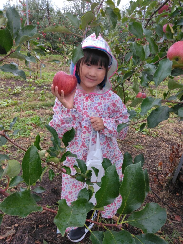 あいにくの雨天気でしたが、りんご園に着くと雨が止み、りんご狩りを楽しむことができましたよ。