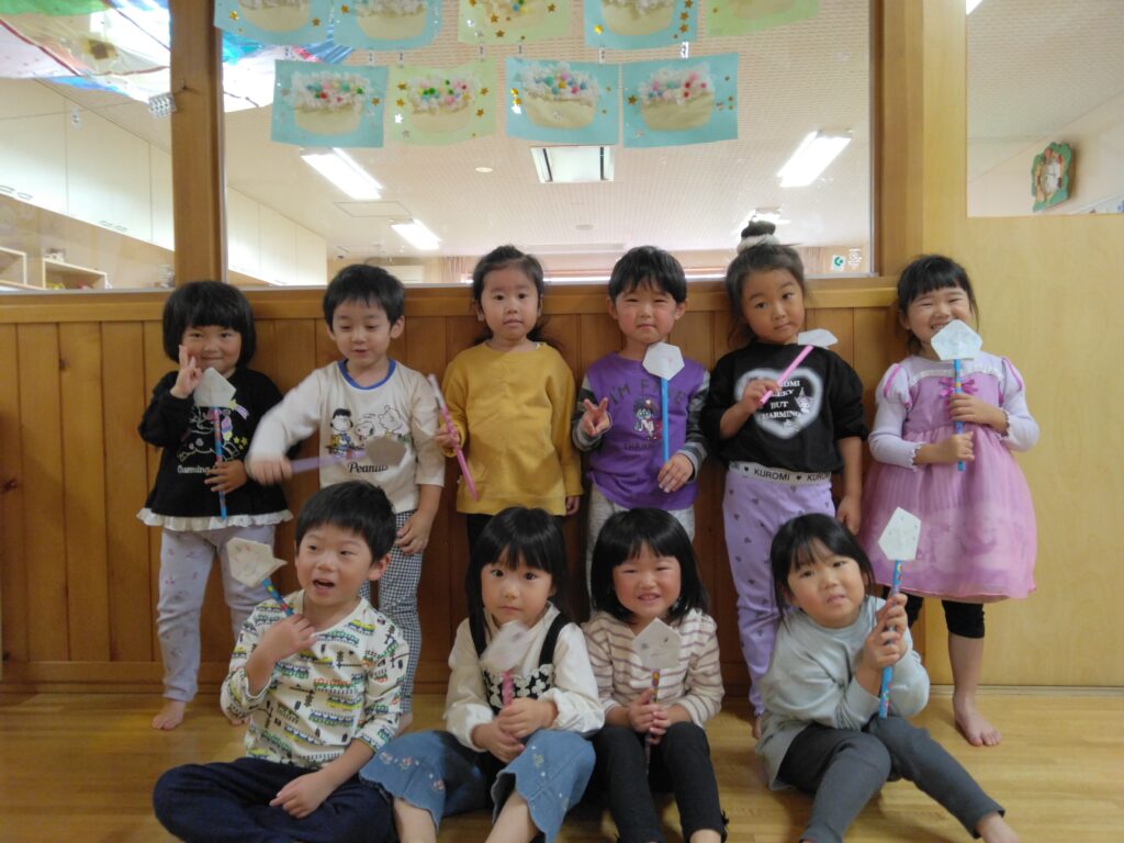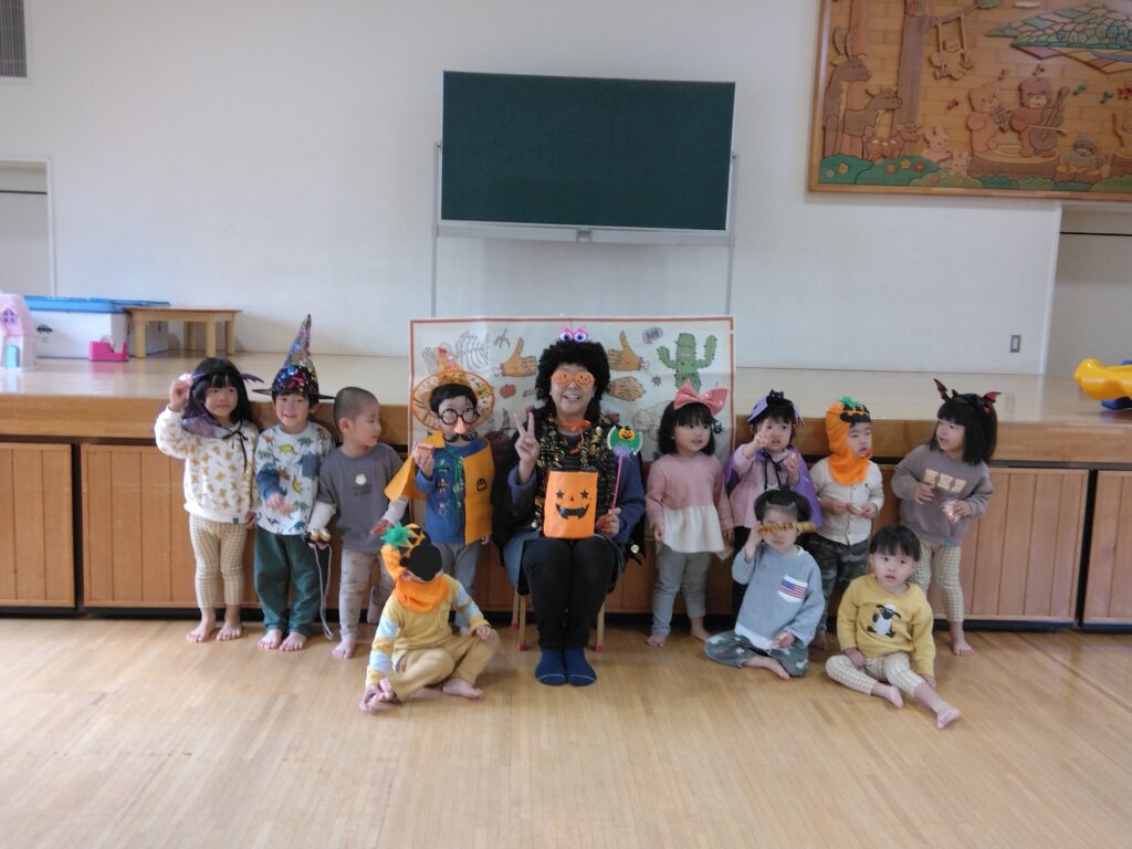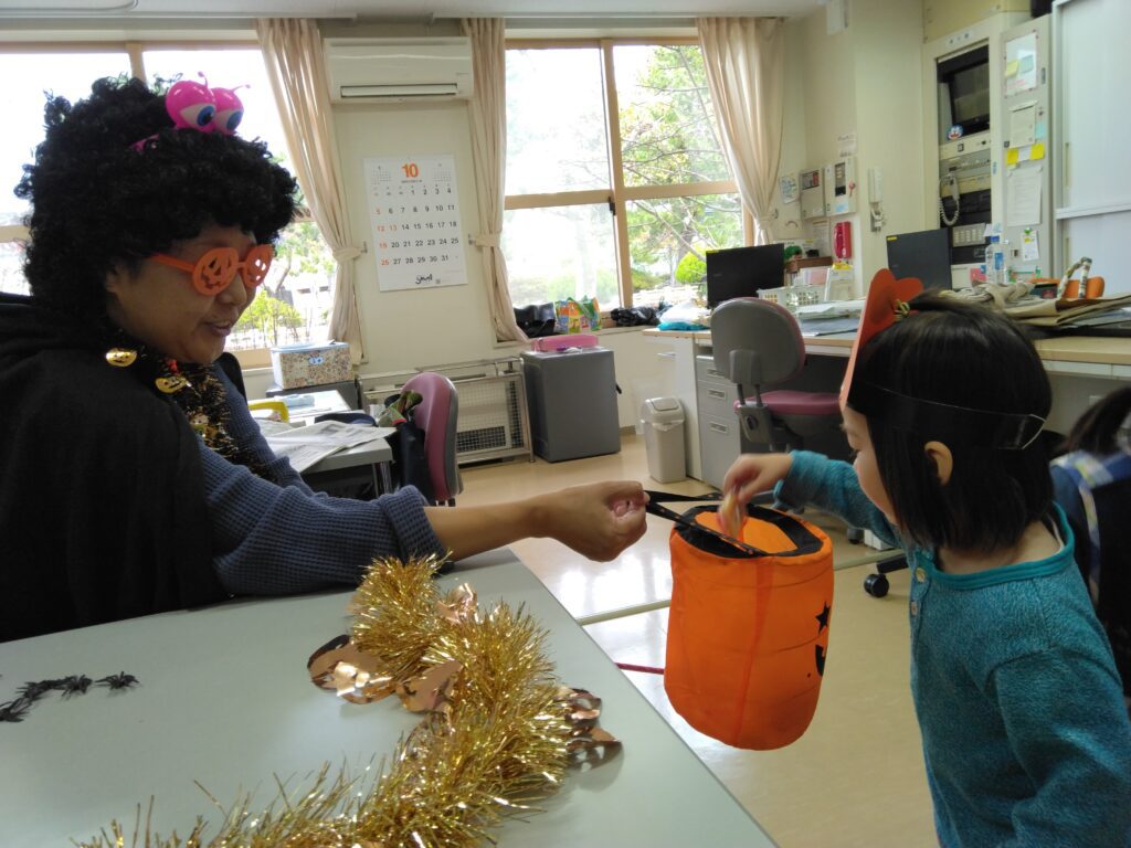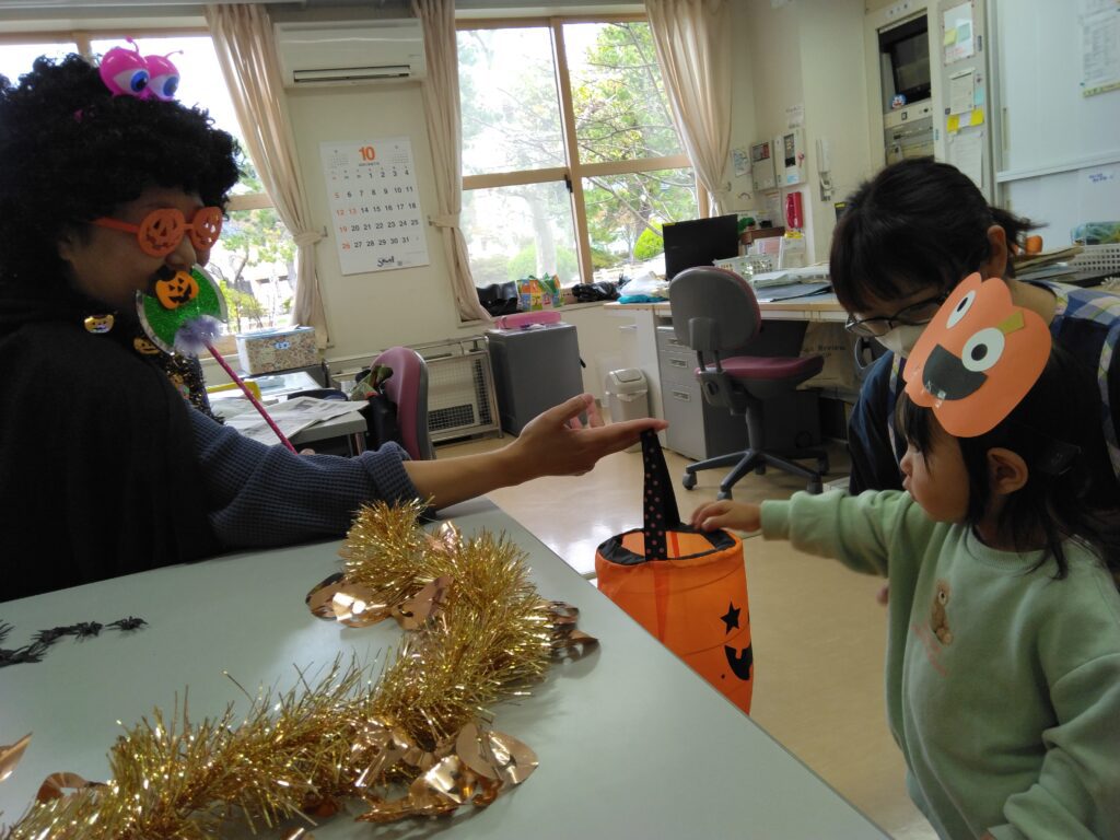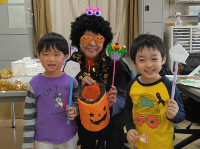 自分で作ったかぼちゃのオバケのお面やステッキを身に付け、ドキドキしながら「(トリック・オア)トリート」と言って、お菓子をもらいましたよ☆