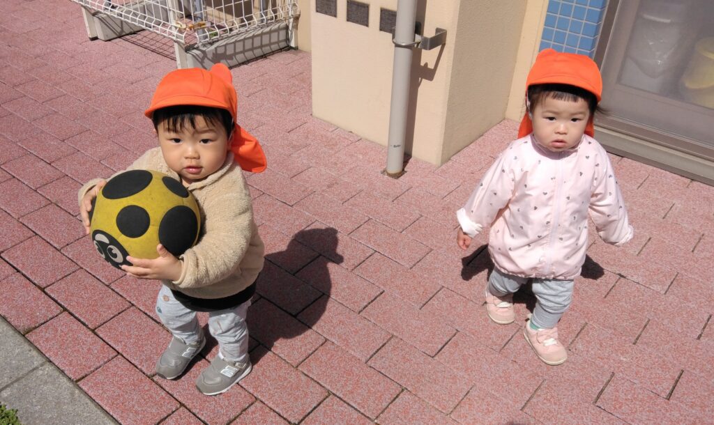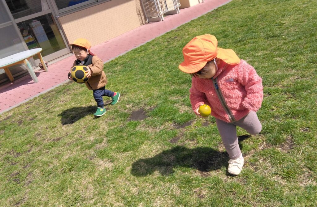 友だちと一緒にボールを運んだり、先生と追いかけっこをして元気に遊んでいます(^▽^)