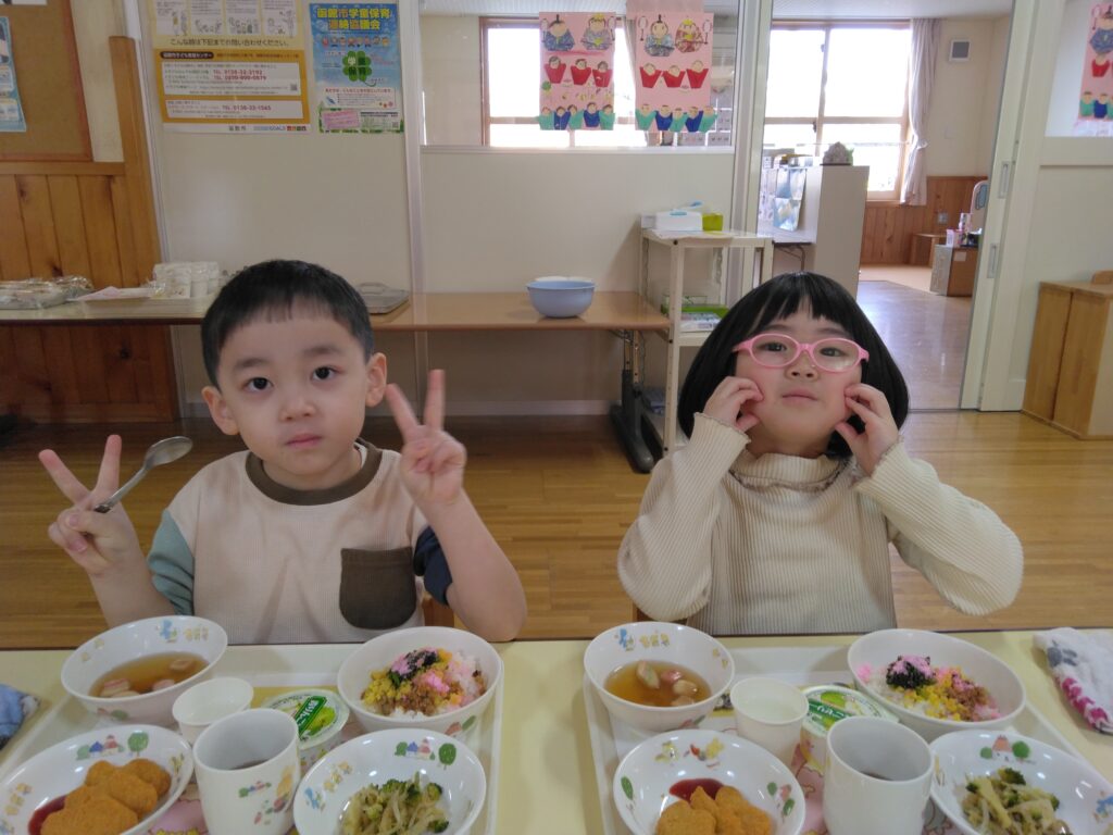 ひなまつり誕生会がありました。3月生まれのお友だちをお祝いしたり、ひなまつりのお話やゲームを楽しんだりしました🎎給食はちらしずしでした!嬉しそうにモリモリ食べていましたよ💕